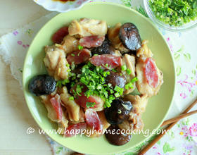 把以上 (1) 放入深碟中,把腊肠排放在冬菇鸡肉上,以大火蒸 10 分钟就行了。