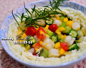 将芒果、奇异果、番茄都切小块状,秋葵切一轮一轮的。