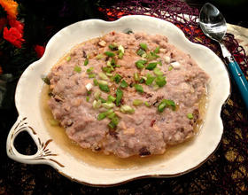 - 4. 将处理好的绞肉平均铺平在盘子上,形成饼状,然后放进烧滚水的蒸锅上,以大火蒸8分钟。