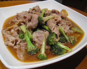 下花椰菜些微拌炒后, 下猪肉片拌炒至猪肉片三分熟时, 再下调味料煨煮至猪肉片全熟即可