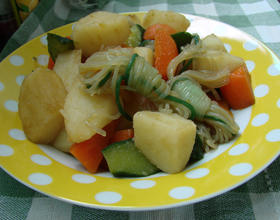 番薯.马铃薯.红萝卜去皮,切成滚刀状,小黄瓜切滚刀状,备用。