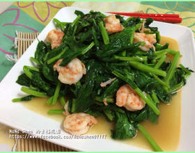 原油锅快炒豆苗,起锅前加入虾仁和调味料速速拌炒均匀即可。