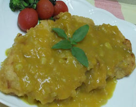 谷盛绿咖哩酱汁淋在鸡排上方即可