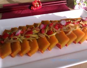 有些网友直接将南瓜切成薄片,摆在盘上放入蒸锅中,这样蒸出来的南瓜,真的很漂亮.但需要ㄧ把很好的刀子.生南瓜很硬我切不动. 我是将南瓜蒸半熟后(当还有些硬度比较好切),取出切片,再放回蒸熟. [酱汁]咸度请自行调整