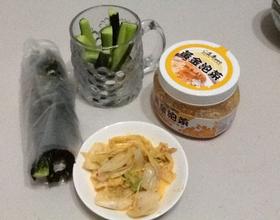 第一层玻璃纸平铺,第二层海苔片然后第三层再玻璃纸放入适量的白米饭摊平,依序放上泡菜、猪排肉片、小黄瓜条、玉米粒....(也可放上肉松,鲔鱼....任何你想加进去的食材),之后洒上些许胡椒盐