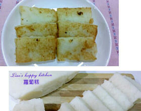 拿出萝卜糕稍微降温,,大约30分钟后,再将年糕纸小心提出来离开容器,完全放凉,就可以食用了。