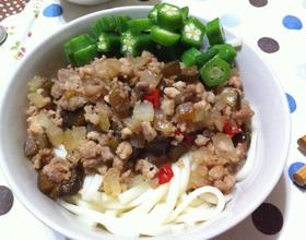 秋葵川烫后切小段,撒在面上拌瓜仔肉一起吃:)