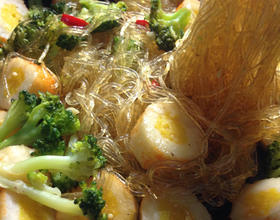 将蒜头、辣椒爆香,鱼卵卷、冬粉、花椰菜下锅炒,加入少许水、酱油、盐巴调味闷30秒,即可上桌啰。
