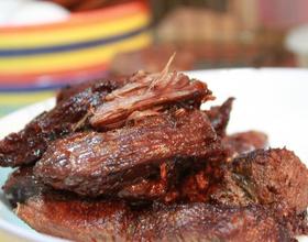 - 3. 乘出,待稍凉一下,按纹理切成条,按纹理切才可以手撕。