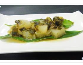 萝卜切块加水放进有点厚度的锅中煮至软,加入奶油、海苔和调味料,拌匀至海苔化开并收干汤汁。