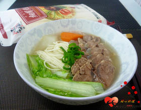 - 5. 取一束细关东面放入滚水中煮2分钟,起锅前加入少许青菜