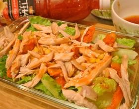 烤鸡剩下的鸡胸肉,剥成丝状,配上蔬菜又是一道美味的料理喔!