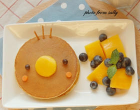 表面起小小后即可翻面 - 4. 煎好的饼皮,加上装饰,即完成小鸡松饼