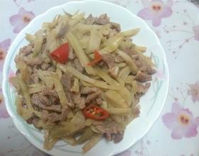 锅中放入3大匙油炒香肉丝约八分熟,泡好榨菜丝放入加少许糖,拌炒一下就可起锅
