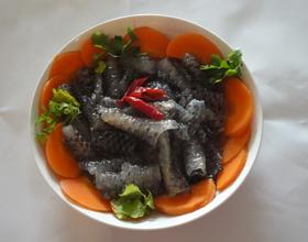 鱼皮放入刚刚烫过菜的热水中过一下热水滤干水分入盘中
