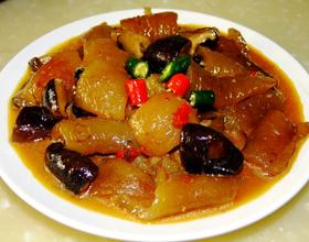 - 6. 倒入沥干的猪皮,炒干水汽,加入料酒,白糖翻炒,再倒入酱油,想少量醋,盐,炒匀,,,再倒入香菇拌匀后,倒入高压锅,加入适量水,压二十分钟,即可