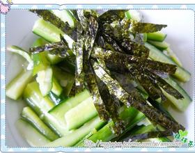 将小黄瓜切丝、蒜头切成末加入糖、醋、蒜未腌至1小时要吃时再淋上香油、海苔丝即可