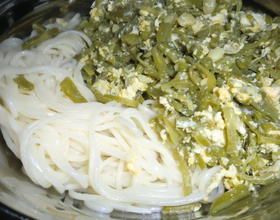 - 19. 把面条捞入盆中,舀入香喷喷的豆角鸡蛋卤,好香呀哈哈