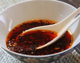 将热油全数倒入辣椒粉中,并用盖子将此碗盖入,将香气锁在碗中