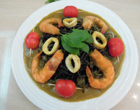 - 8. 叠上墨鱼面,放入海鲜,切一些小番茄放上摆盘,因谷盛绿咖哩的口味浓郁,所以搭配小番茄的清甜微酸,真是恰到好处
