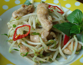 已2大匙油热锅,放入鸡胸肉丝炒熟盛起,再以一大匙油将蒜末爆香,加入豆芽菜及调味料2快速翻炒,倒入鸡丝.辣椒丝及九层塔略炒,即可熄火盛盘。