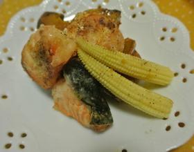 南瓜铺底,依序铺上玉米笋,鲑鱼块,表面淋上橄榄油,胡椒粉,海盐