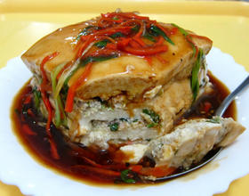 豆腐横切分成4等份;一层豆腐一层馅料,总共七层。