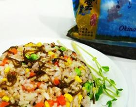 起油锅下姜丝炒香依序放入红萝卜、青豆仁、玉米粒、豆包、水云(最后放),加少许酱油,放入五谷饭,调味起锅前淋少许麻油即可盛盘享用。