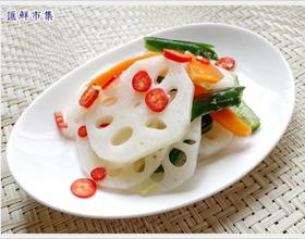 将所有调味料拌匀后,拌入备好的莲藕、红萝卜及小黄瓜