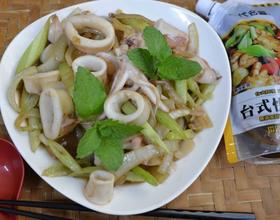 先处理蔬菜与乌贼干净后切好备用,并热锅爆香蒜片加入等食材并放快炒酱调味拌炒均匀