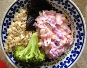 +2+无糖酸奶+盐少许+切细的新鲜紫苏叶,拌匀即可配上薏仁糙米饭+花椰菜,春天气息浓浓的山药紫苏沙拉饭完成