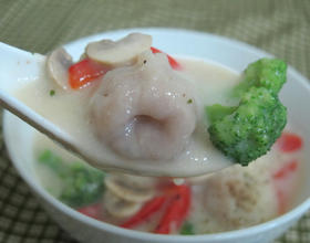- 2. 鱼饺煮至8分熟后,放入青花椰菜和浓汤粉,要一直搅拌粉才不会结块。