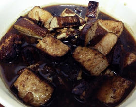 豆干对切,再切片!热油锅炸豆干,炸至表面酥酥后将卤汁缓缓倒入,试好味道后盖锅盖制卤汁滚,在转中火卤5分锺,再转小火卤5分锺,熄火闷至入味!