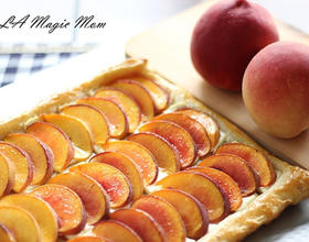- 1. 冷冻酥皮退冰后摊平,桃子切成0.5cm薄片, Cream Cheese切成约0.3cm的薄片