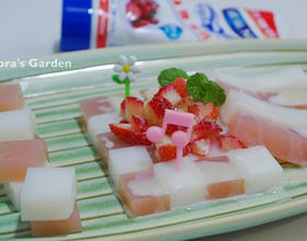- 6. 水和寒天条照炼乳的方式煮溶解、加糖和5.的草莓汁,稍微拌煮一下即熄火(避免破坏维他命C)。