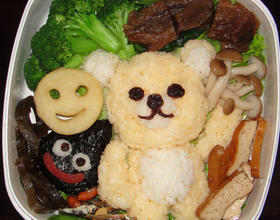 小熊饭团-留一些白饭,再将其馀白饭+蛋汁+少许盐(或柴鱼粉)拌炒后稍为放冷,用「保鲜膜」捏成可爱熊熊的形状