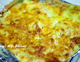 均匀铺上起司条,上火180度将起司条烤至融化到酥脆的金黄色,即可取出