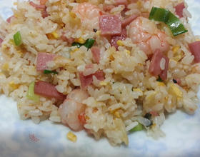 锅内放入橄榄油 洋葱丁先炒香再加入奶油 火腿丁 葱白 虾仁略炒后先起锅,锅内加一些油 将打散的蛋倒入煎半熟后 把饭及所有食材倒入一起炒