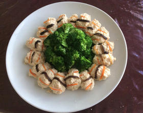 放入蒸笼蒸约8分钟即可。烫些芥兰花菜放盘中央,蒸好的琵琶豆腐围绕一圈就是简单的摆盘了。