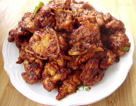 - 8. 将番茄酱汁全部裹在肉段中,最后加入味精调味。