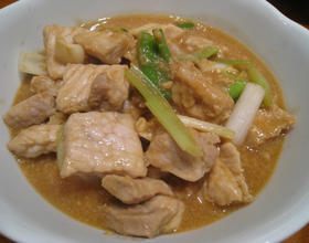 下猪里脊拌炒至五分熟, 下调味料煮至猪里脊全熟, 起锅前下葱段即可
