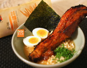 - 9. 在面碗加入汤,放入烤好的叉烧、水煮蛋、葱花、大片海苔,就是完美的巨型叉烧拉面!