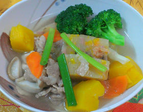 炒好后加入汤约2公升,南瓜煮熟后加入葱与肉片,还有切块的金瓜糕,调味后就可以食用啰~~