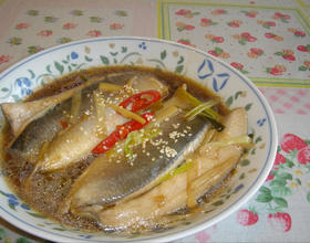 起少许油油锅先将葱段.辣椒片炒香-->放入虱目鱼稍微两面煎一下-->加入适量寿喜烧酱及水-->闷煮至虱目鱼全熟透-->完成!