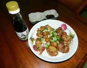将炸好的鸡块,沥干油后,装盘,再洒上葱花,即可,可于调味盘中于入椒盐粉及龟甲万香菇海带酱油来增添风味