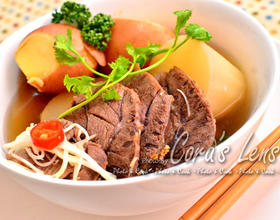 - 2. 快锅中烧滚六碗公的水,放入中药包、海带酱油、酒,与两条烫好的牛腱、白萝卜与马铃薯。盖锅盖水滚后转小火,炖30分钟,关火盖锅盖闷一个小时。即可~ 汤鲜美、牛肉口感也棒。