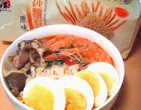 面条煮约二分钟后,加入五花牛肉及虾子,捞起前撒上葱花即可