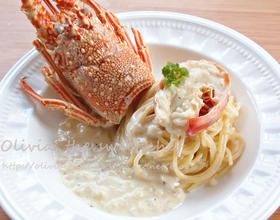 加入鲜奶油、虾膏、龙虾的身体,煮至微微沸腾,