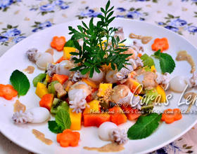 木瓜、奇异果、芒果都切丁,排在盘中,放上墨鱼、红萝卜片、薄荷叶,淋上味噌酱。再洒上白芝麻与马鞭草排盘,即可。