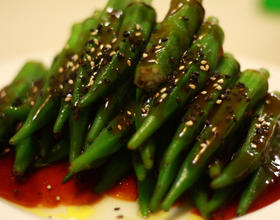 将秋葵排在盘中,淋上亚麻仁油.酱油膏,洒上芝麻即可食用。